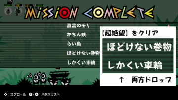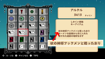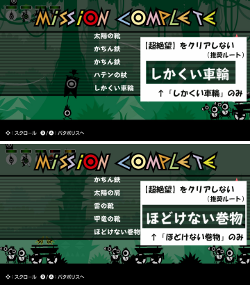 アイテムの説明は「杖の神将フックメン」と戦って入手した事になっていますが・・・「M:超絶望」を攻略した時点で、本来追加ミッションで入手する「しかくい車輪」「ほどけない巻物」が入手(ドロップ)するよう、修正されていたみたいです。