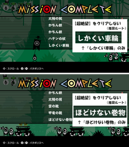 ➆「M:槍の神将キーメン」をクリアすると、「M:超絶望」から変更していた「M:超絶望への挑戦」が、更に「M:超希望への放物線」に変更。ここでようやく攻略!このステージで「S:ググチョッパ遺跡」の「M:ググッチョパ遺跡の怒れる爪(「チョッキンナ戦への卵」入手)」を解放するキーアイテム「ほどけない巻物」が手に入る。